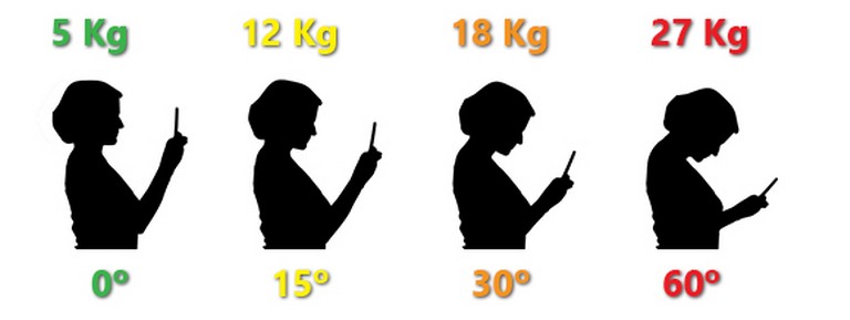 A cabeça humana pesa pouco mais de 5 kg (ângulo de 0º). À medida que a angulação aumenta essa força também aumenta. Em um ângulo de 15º este peso é de cerca de 12 kg; a 30º é de cerca de 18 kg e começa a prejudicar o funcionamento dospulmões e outros órgãos interligados;a60º é de cerca de 27 kg e prejudica a coluna e gera dores severas ao corpo. Logo, inclinar a cabeça gera bastante pressão no pescoço.